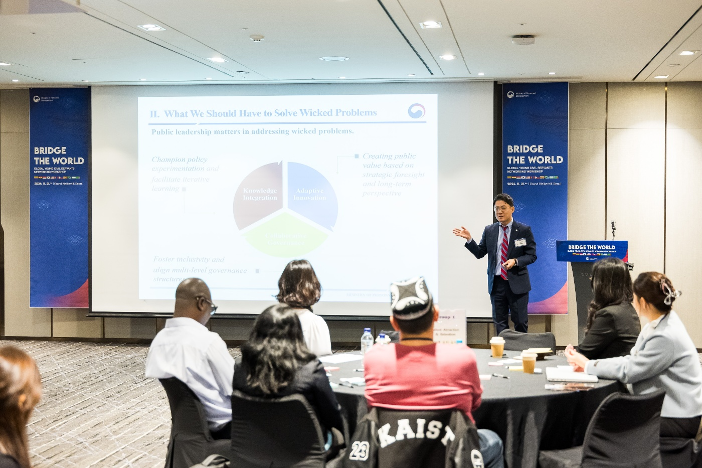 이어, 현재 우리나라에서 교육을 받고 있는 외국 청년 공무원들과 국제협력 업무를 담당하고 있는 국내 청년 공무원들을 대상으로 진행된 Global Young Civil Servants Networking Workshop에서 우리 행정학과 학생들은 최돈위 교수와 함께 직접 교육과정을 진행하였습니다. Public Entrepreneurs in Collaborative Networks라는 주제로 진행된 최돈위 교수의 강의에 이어, 우리 학생들은 국내외 공무원들이 인사행정의 주요 이슈들에 대해 심도 있게 토론하는 일련의 과정을 주도하였습니다. 해당 토론은 인재 유치 및 유지, 조직 내 성장, 공직문화 혁신, 웰빙과 마음건강이라는 4가지 주제로 진행되었는데, 우리 4명의 학생들은 각자 하나의 그룹을 맡아, 인사행정론 수업시간에 배운 긍정혁신을 위한 4D 모델(Discovery-Dream-Design-Destiny)을 활용하여, 국내외 청년 공무원들이 해당 주제에 대해 다함께 고민하고, 보다 나은 미래를 기획 및 디자인하는 일련의 과정을 촉진하는 퍼실리테이터 역할을 수행하였습니다.