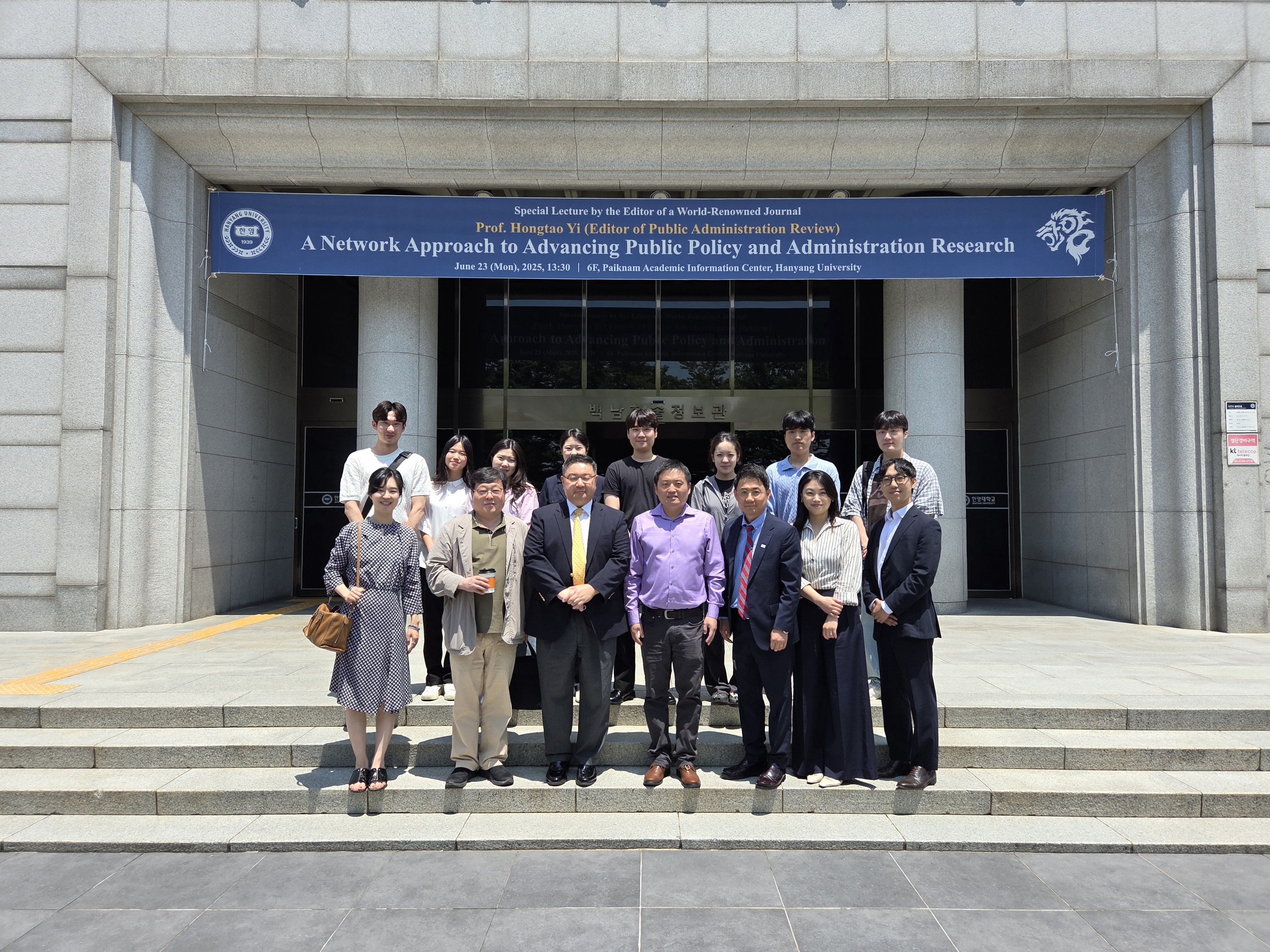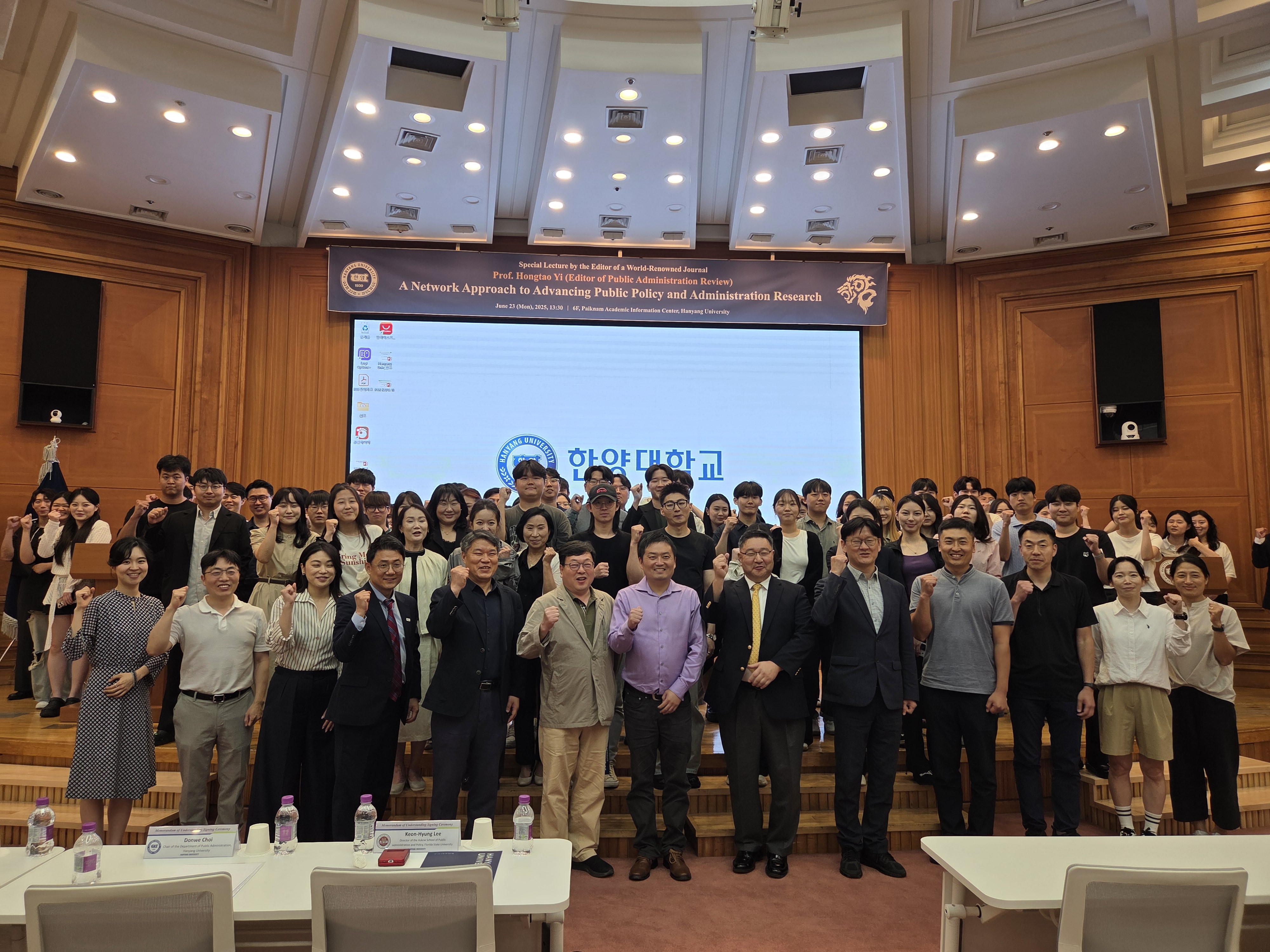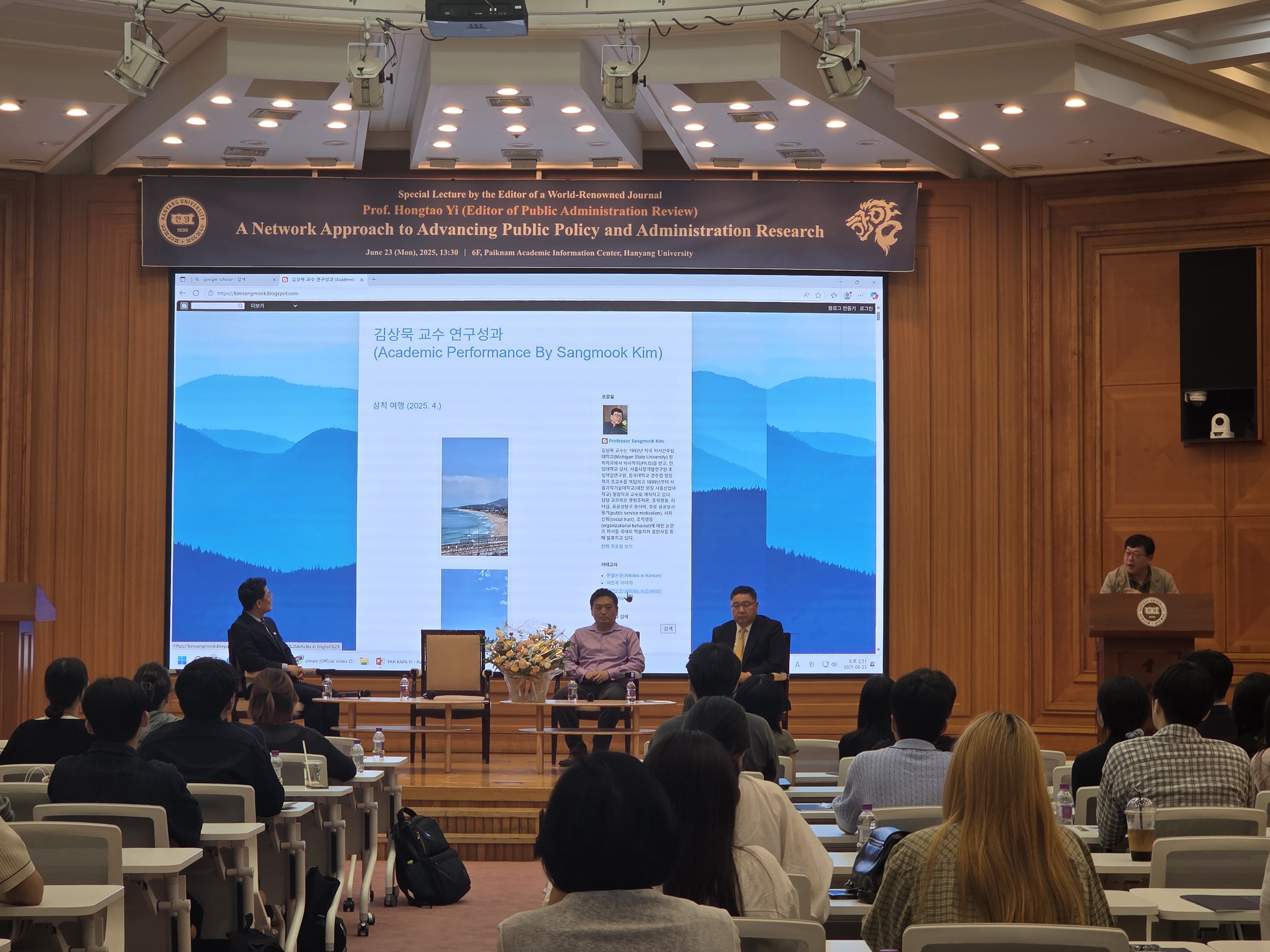 우리 행정학과에서는 지난 6월 23일(월) 국제저명학술지 편집장 초청 특별강연을 개최하였습니다. 오후 1시 30분부터 3시 30분까지 백남학술정보관 6층에서 실시된 본 특별강연에서는 행정학 최고 권위의 저널 Public Administration Review의 편집장이신 Hongtao Yi 플로리다주립대 교수님이 A Network Approach to Advancing Public Policy and Administration Research라는 제목으로 연구발표를 해주신 동시에, 우리 행정학과 80학번 동문이자 세계적으로 가장 널리 알려진 한국 행정학자들 중 한 분이신 공공봉사동기 연구의 대가 김상묵 서울과기대 교수님과 플로리다주립대 Askew School의 Director이시자 Public Health Policy and Management 연구로 저명하신 Keon-Hyung Lee 교수님께서 Top Journal에 Publication을 하기 위한 전략들이란 주제로 Hongtao Yi 교수님과 함께 대담을 진행해 주셨습니다.