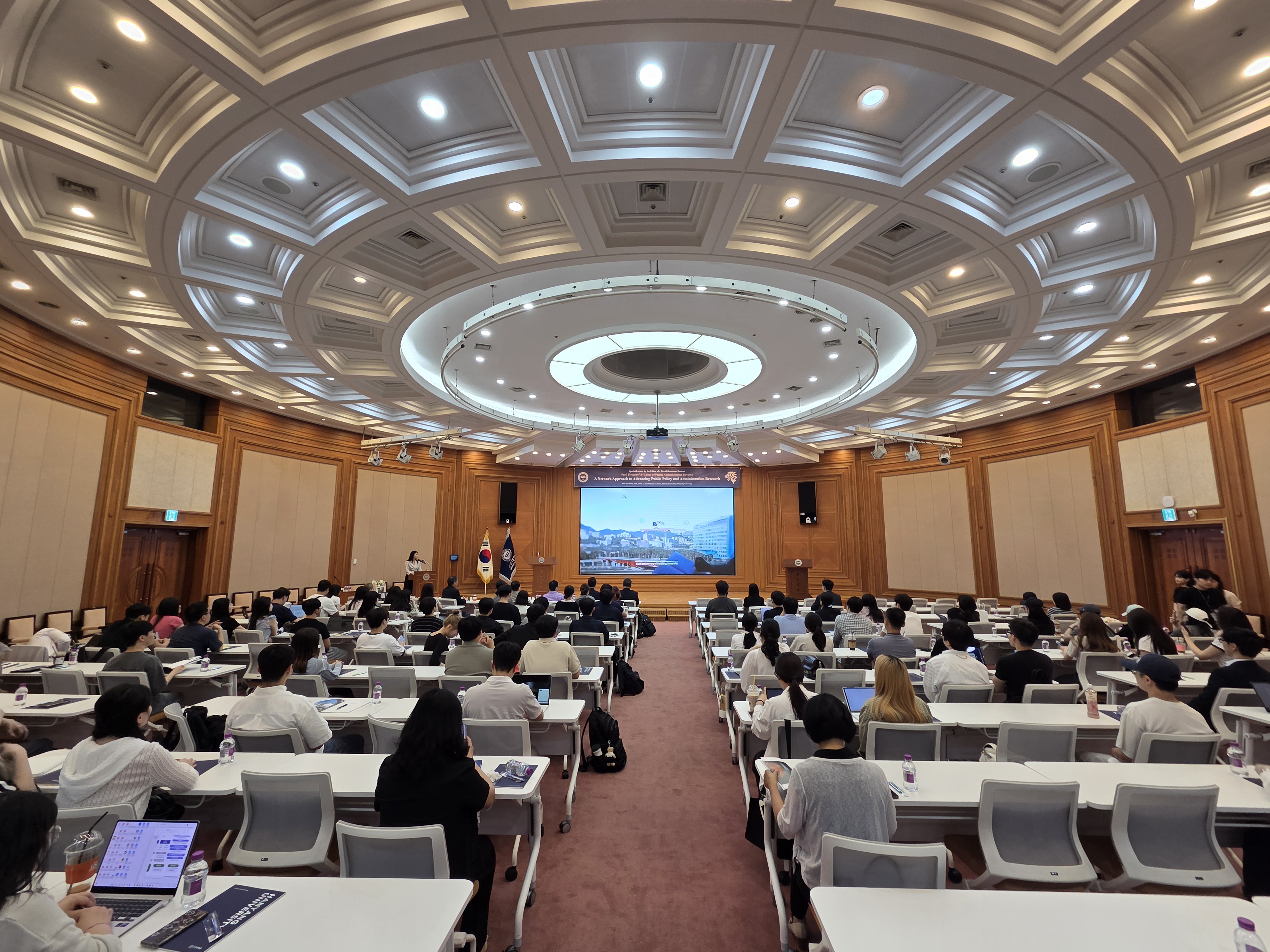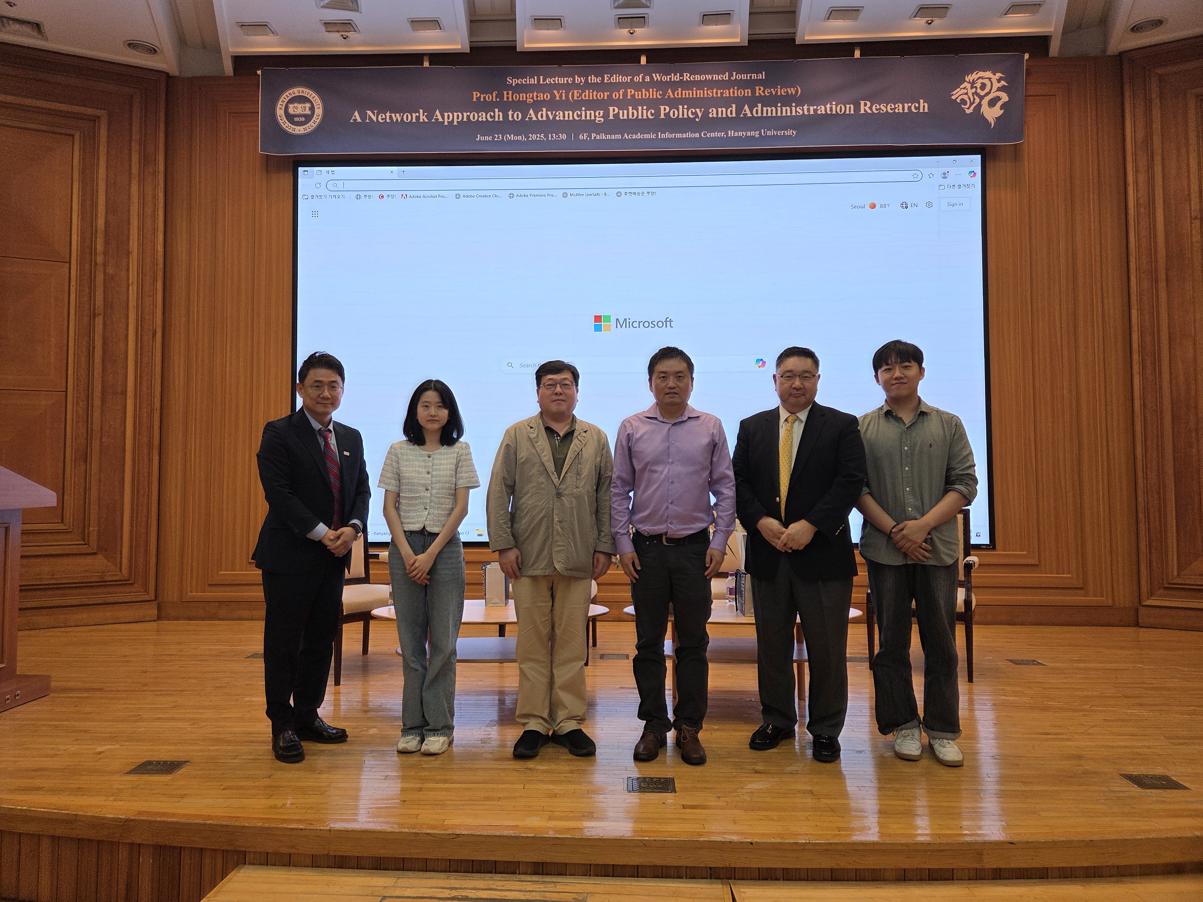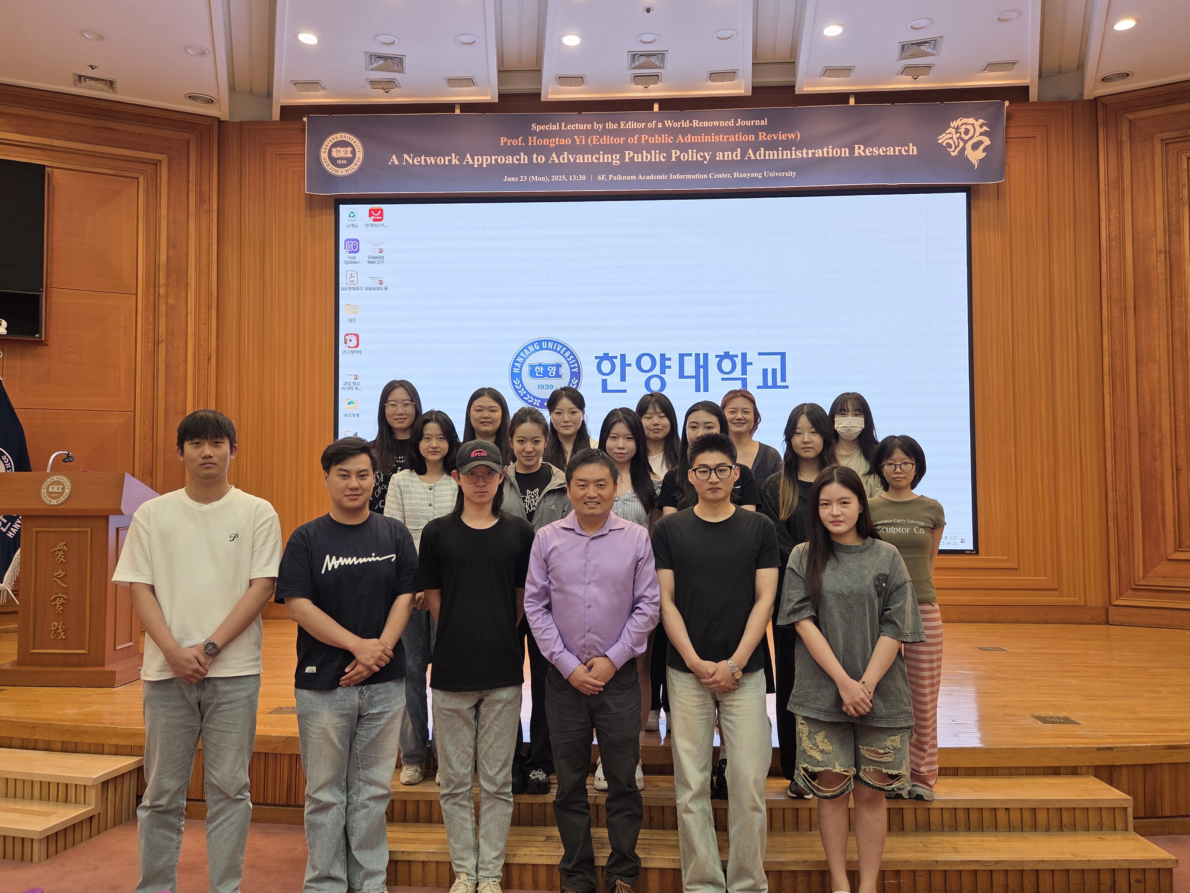 우리 행정학과에서는 지난 6월 23일(월) 국제저명학술지 편집장 초청 특별강연을 개최하였습니다. 오후 1시 30분부터 3시 30분까지 백남학술정보관 6층에서 실시된 본 특별강연에서는 행정학 최고 권위의 저널 Public Administration Review의 편집장이신 Hongtao Yi 플로리다주립대 교수님이 A Network Approach to Advancing Public Policy and Administration Research라는 제목으로 연구발표를 해주신 동시에, 우리 행정학과 80학번 동문이자 세계적으로 가장 널리 알려진 한국 행정학자들 중 한 분이신 공공봉사동기 연구의 대가 김상묵 서울과기대 교수님과 플로리다주립대 Askew School의 Director이시자 Public Health Policy and Management 연구로 저명하신 Keon-Hyung Lee 교수님께서 Top Journal에 Publication을 하기 위한 전략들이란 주제로 Hongtao Yi 교수님과 함께 대담을 진행해 주셨습니다.