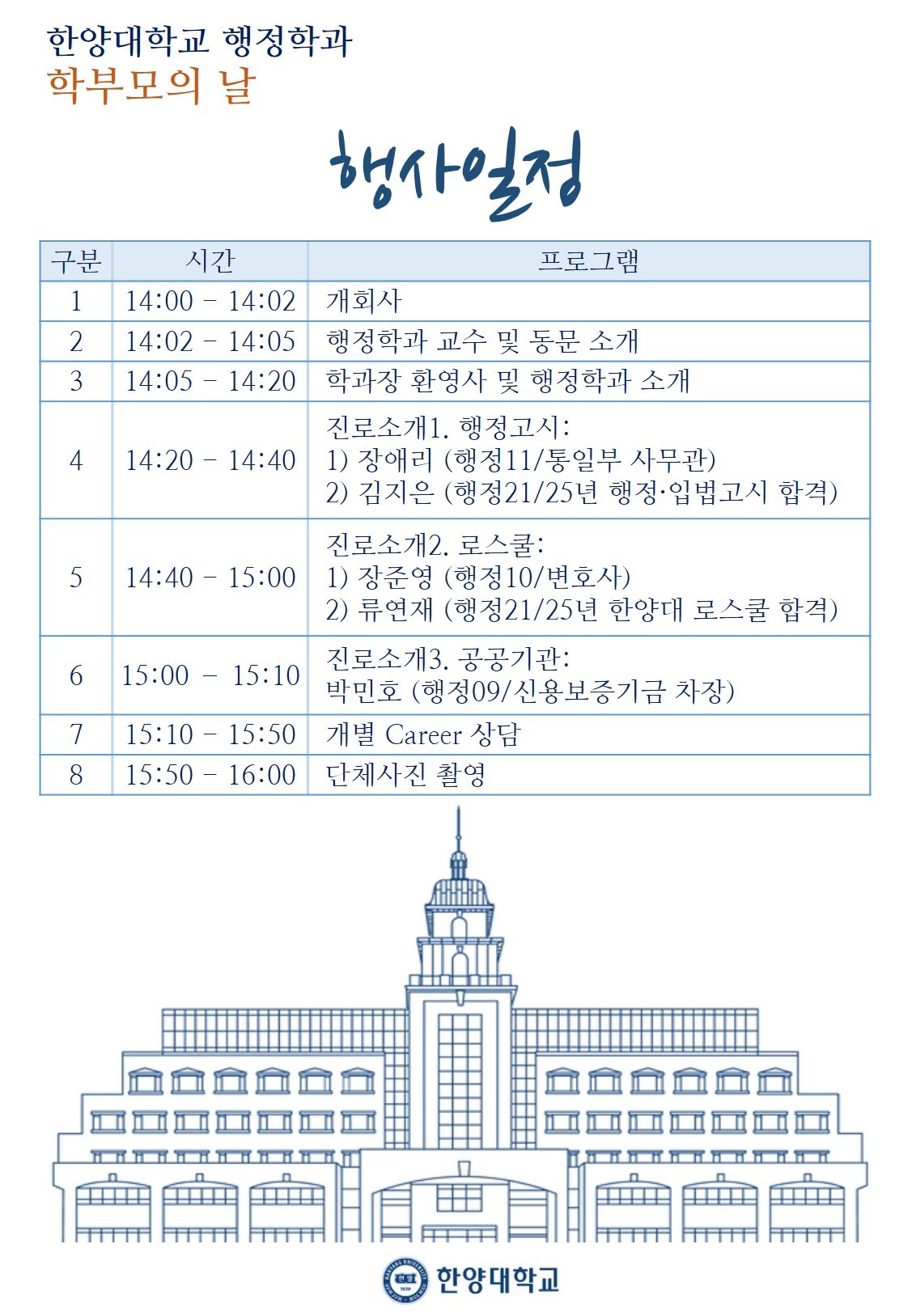 "귀하게 키운 자녀분을 한양에 보내주심을 감사드립니다"라는 초대의 글처럼, 이번 행사는 한양대 행정학과의 새로운 가족이 되신 것을 진심으로 축하하고, 자녀분들이 일구어 나갈 빛나는 미래를 행정학과의 테두리 안에서 함께 탐색하며 계획하기 위해 마련된 뜻깊은 자리였습니다.