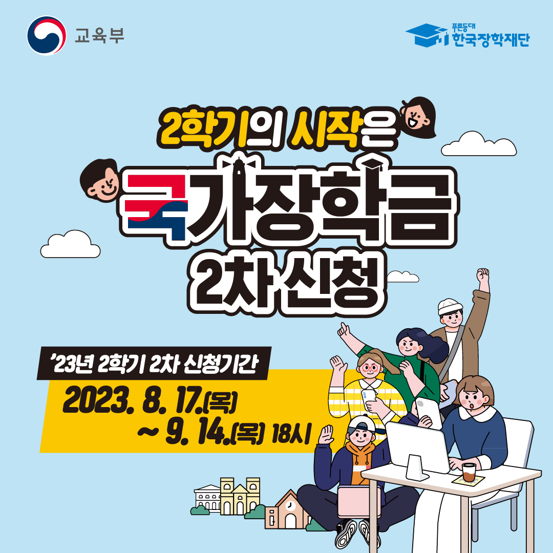 ◎ 신청기간 : 2023.8.17.(목) 9시 ~ 2023.9.14.(목) 18시 ◎ 서류제출 및 가구원 동의기간 : 2023.8.17.(목) 9시 ~ 2023.9.21.(목) 18시 ◎ 신청대상 : 신입생(2학기 입학예정자), 편입생, 재입학생, 복학생, 재학생(구제조건부) ◎ 신청방법 : 한국장학재단 홈페이지(www.kosaf.go.kr) 및 모바일 앱에서 신청 ◎ 신청문의 : 한국장학재단 상담센터 ☏1599-2000 |