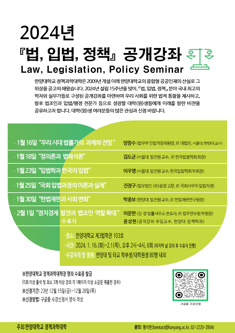한양대학교 정책과학대학은 2009년 개설 이래 한양대학교의 융합형 공공인재의 산실로 그 위상을 공고히 해왔습니다. 2024년 설립 15주년을 맞아, 『법, 입법, 정책』 분야 국내 최고의 학자와 실무가들로 구성된 공개강좌를 마련하여 우리 사회를 위한 법적 통찰을 제시하고, 향후 법조인과 입법/행정 전문가 등으로 성장할 대학(원)생들에게 미래를 향한 비전을 공유하고자 합니다. 대학(원)생 여러분들의 많은 관심과 신청 바랍니다.