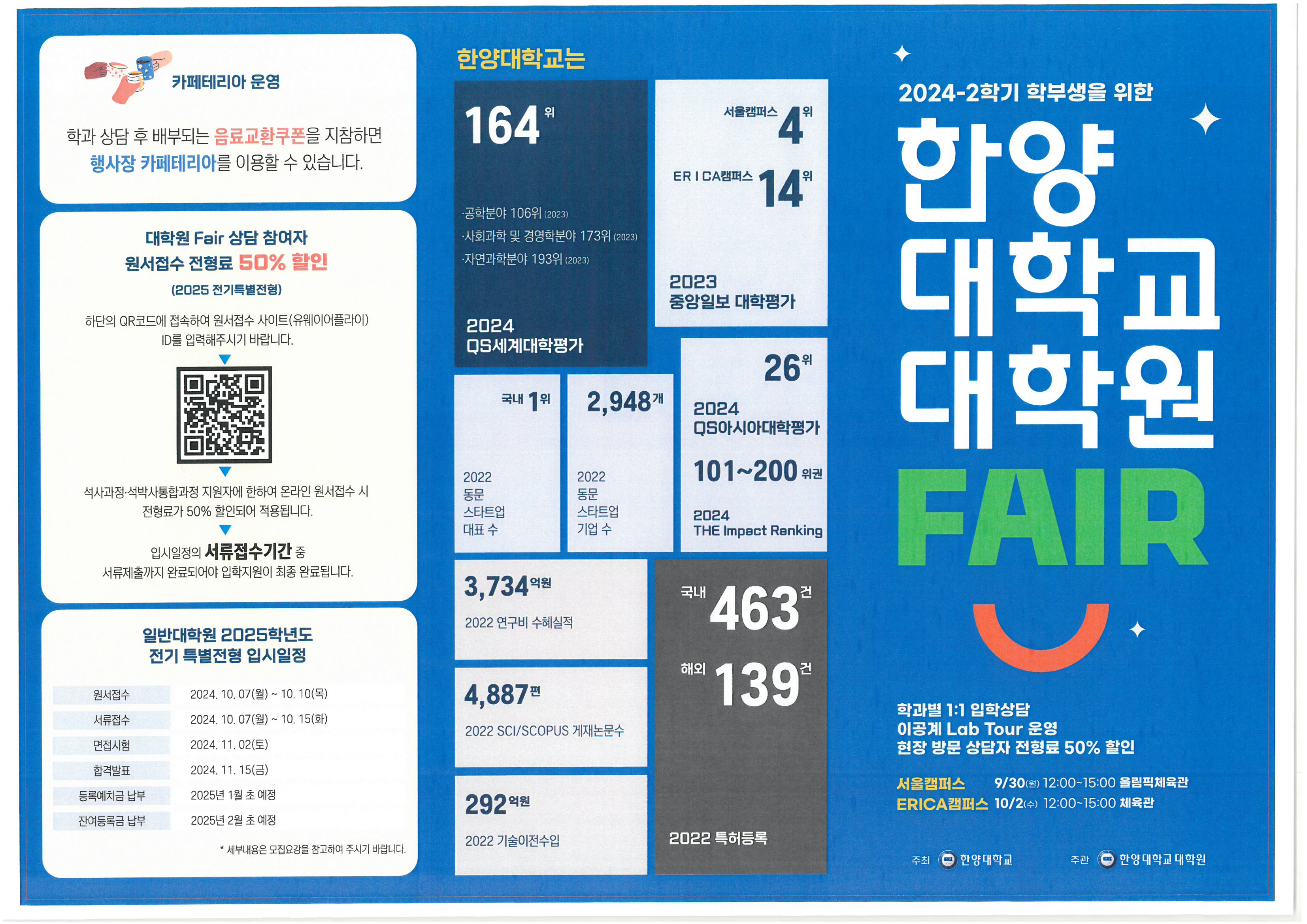 - 상담자 대상 2025년도 전기 특별전형 원서접수 전형료 50% 할인(행사 참여자에 대해 원서접수 ID(유웨이 어플라이)를 취합해, 원서접수시 전형로 50% 할인 적용 예정 → 유웨이 어플라이 회원 가입 후 상담 테이블 위 방명록 종이에 ID 작성) ※ 석사입학, 석박입학 시에만 혜택 적용 가능