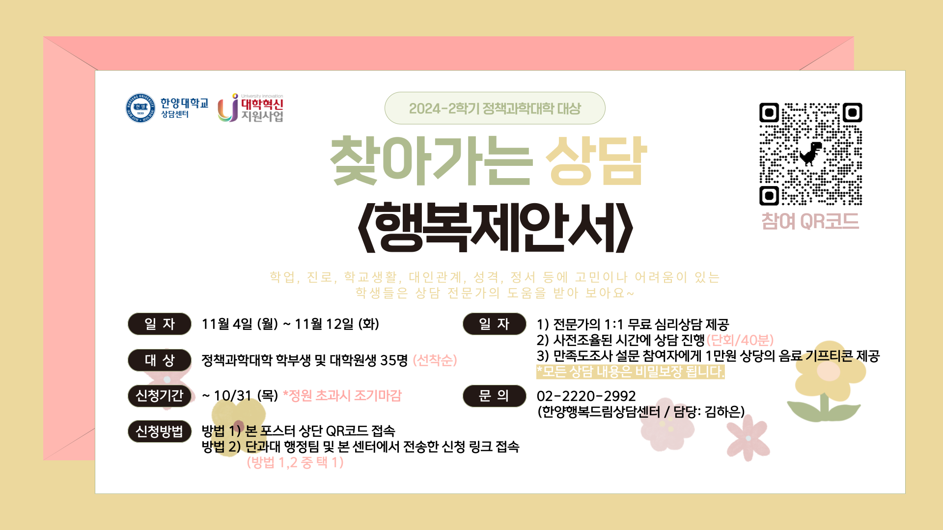 4. 운영방법 : QR 및 구글링크를 통해 사전 신청한 학생 대상으로 1:1 심리상담 진행