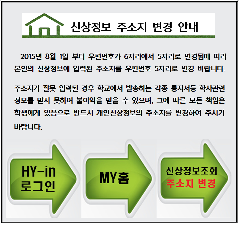 주소가 변경되어 있지 않은 학생은 학사 관련 안내(각종 통지서)를 받지 못하는 경우가 있으니 반드시 주소지를 변경하여 주시기 바랍니다.