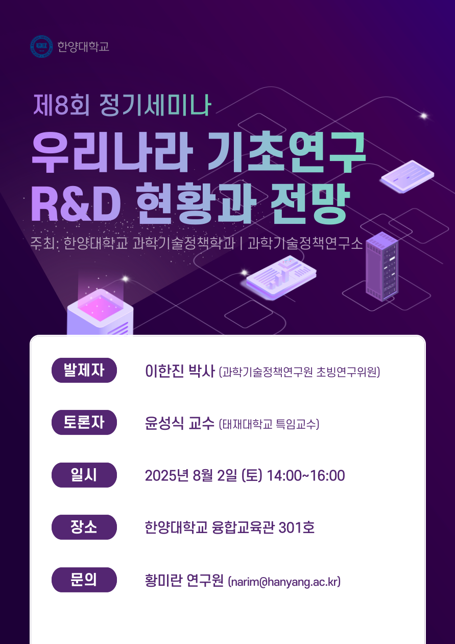 한양대학교 과학기술정책학과에서는 '과학기술전문인력 육성・지원' 사업의 일환으로 재학생 및 참여자 여러분의 지식과 역량을 더욱 높이기 위해 정기적으로 세미나를 개최하고 있습니다.