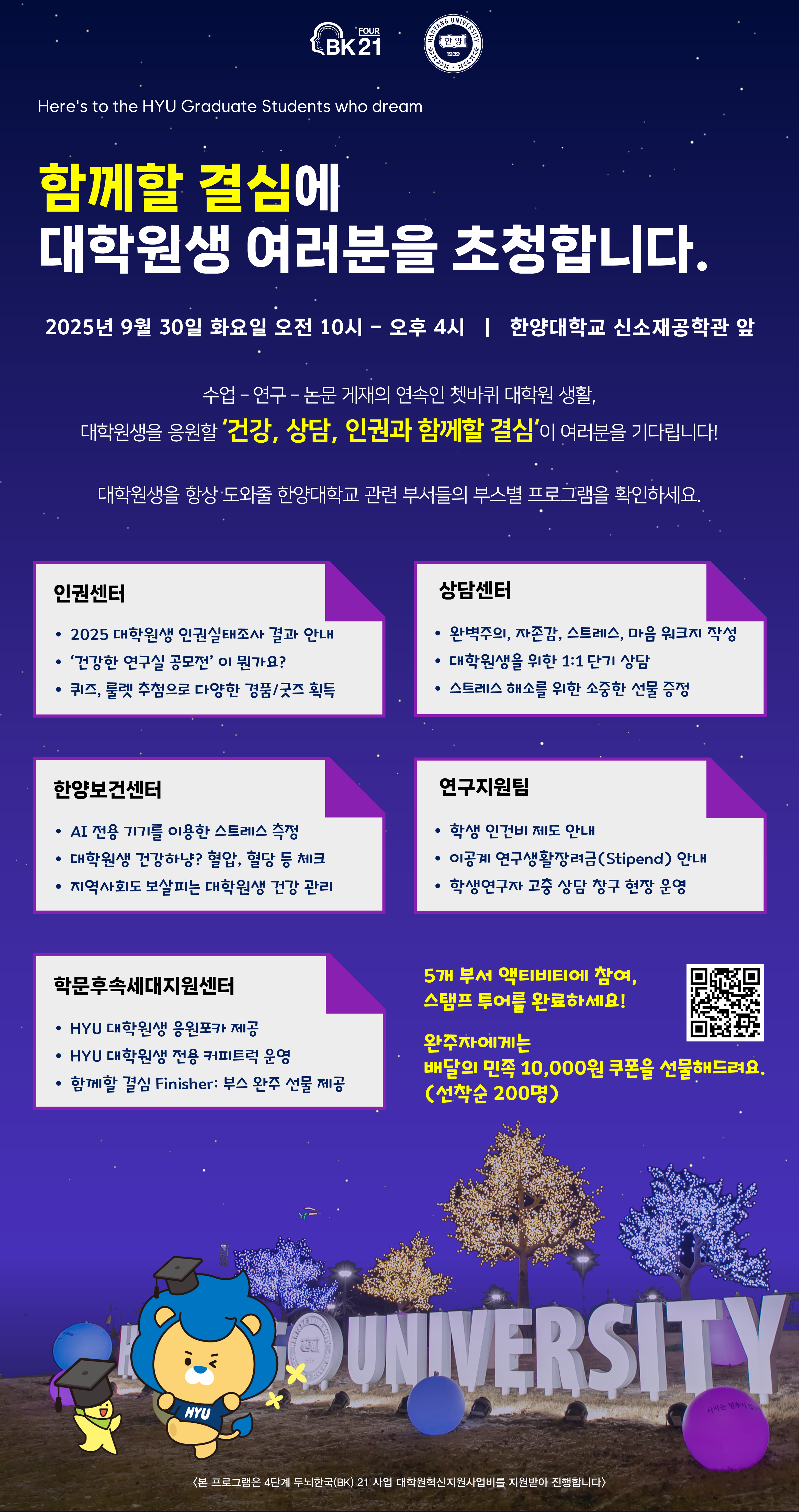 4단계 BK21 대학원 혁신지원사업의 일환으로 '2025 건강, 상담, 인권과 함께할 결심: HY-BK21 일반대학원생 행복찾기 페스티벌'을 다음과 같이 안내드립니다.