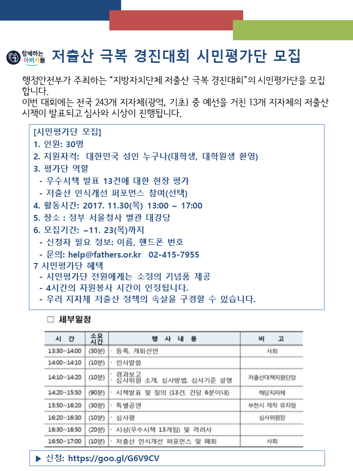 이번에 행정안전부가 주최하는 “지방자치단체 저출산 극복 경진대회”의 시민평가단 모집을 함께하는아버지들이 담당하게 되어 이에 ‘대학생 정책 평가 모니터단’을 모집하고자 메일을 보내게 되었습니다.