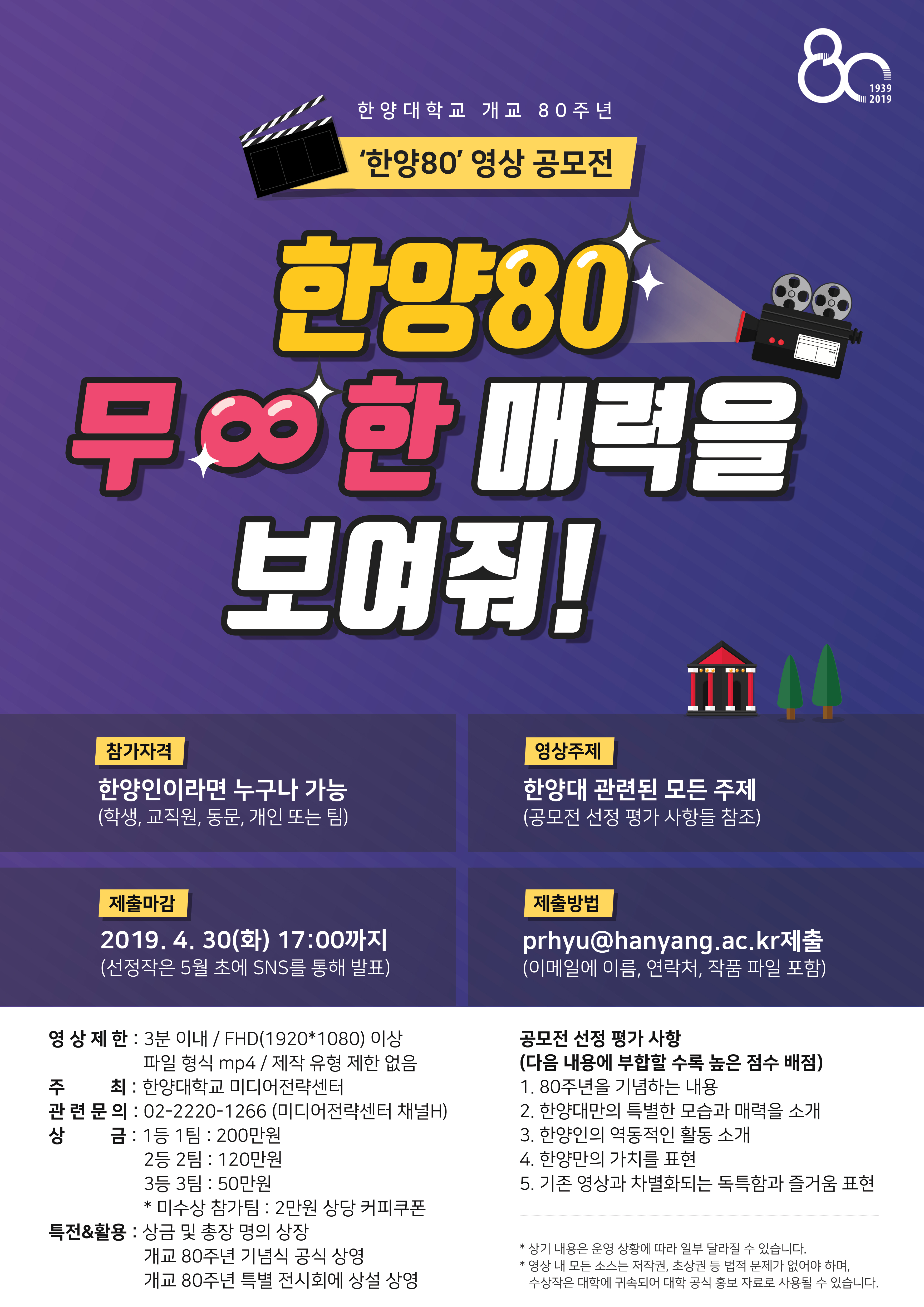 미디어전략센터는 우리 대학 개교 80주년을 기념하여 한양 구성원들의 참여를 통한 의미있는 콘텐츠 제작을 위해 영상 공모전을 시행하오니, 많은 관심과 참여 바랍니다.