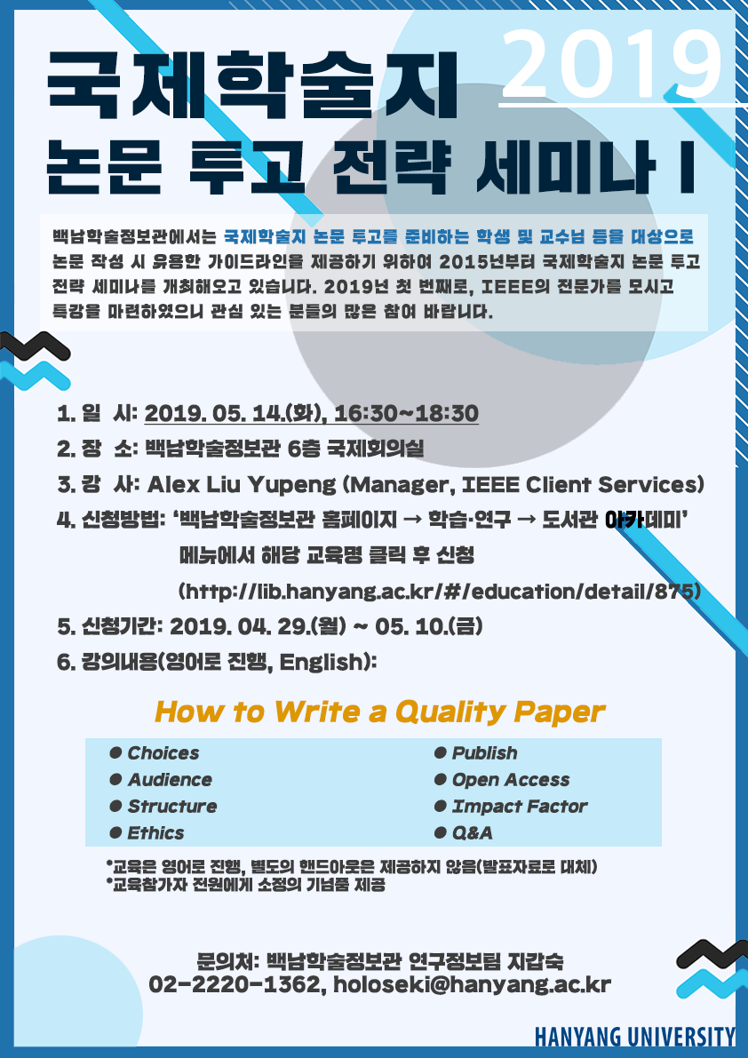 1. 세미나명 : 2019 국제학술지 논문 투고 전략 세미나 I (영어로 진행)