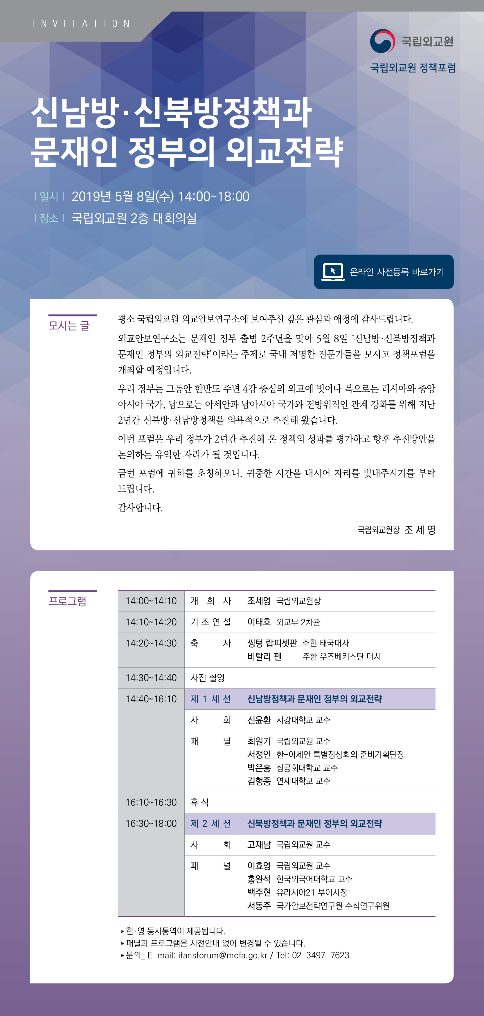 o 일시 및 장소 : 2019.5.8.(수) 14:00-18:00, 국립외교원 2층 대회의실