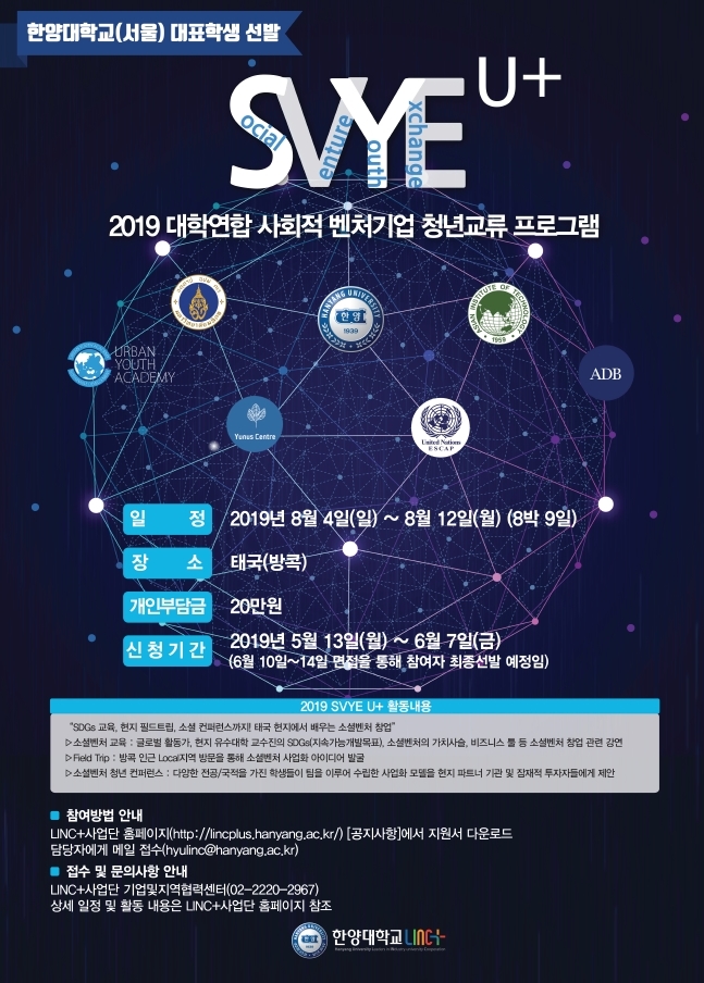 LINC+사업단에서는 소셜벤처 창업을 준비하는 학생들에게 글로벌 현장 체험 및 실전 소셜벤처 창업교육의 기회를 제공하고자 「2019 대학연합 사회적 벤처기업 청년교류 프로그램」을 개최하고자 합니다. 관심있는 학생들의 많은 참여 바랍니다.