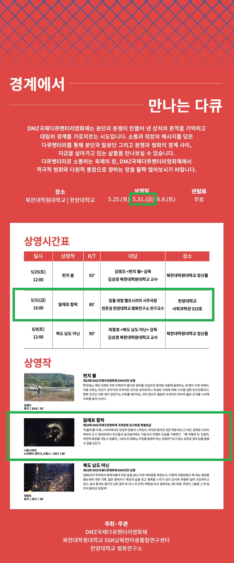 오는 5/31(금)에 한양대학교 평화연구소(소장: 정치외교학과 최진우 교수)외 3기관 공동 주관으로 무료 영화 상영회가 아래 내용으로 개최됩니다. 정책과학대학 학생들의 많은 참여 부탁 바랍니다.